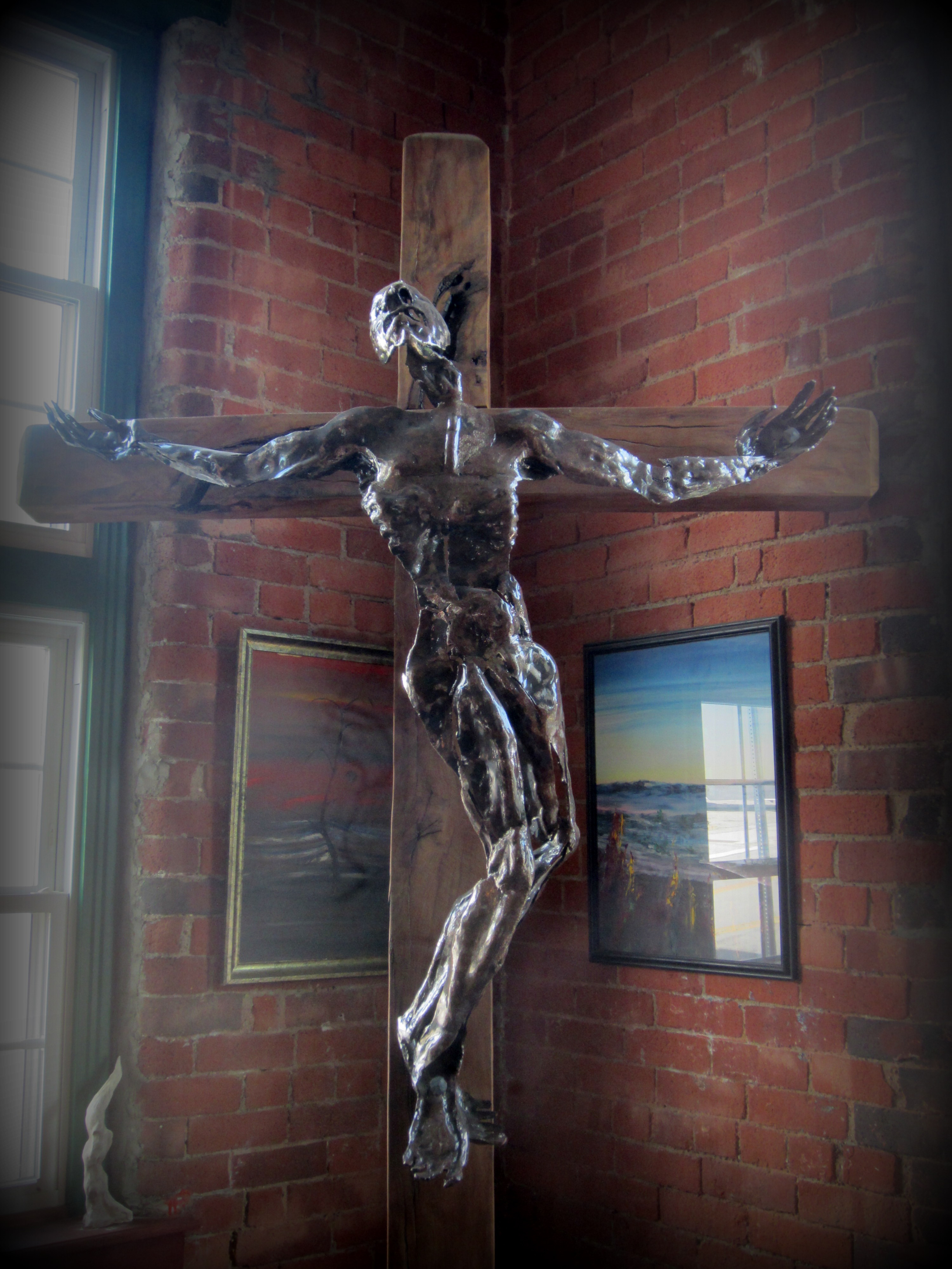The combination of the black and white tile floor and the one piece wooden tables gives an aesthetic that I’m going to call “1950s diner meets ski lodge” (google images associated with the words “1950s diner” and see what comes up). Taking this quirky combination a step further are two sculptures located on opposite sides of the bar. Guarding the entrance to the toilets is a five foot tall statue that would not be out of place in a Polynesian restaurant. In the opposite corner is a nearly life size metal sculpture of Christ suffering on the cross. It’s a serious piece of art, but it seems a little solemn for a venue that regularly hosts polka bands (the Chardon Polka Band are shooting a video at JAFB on August 15, don’t miss it).
