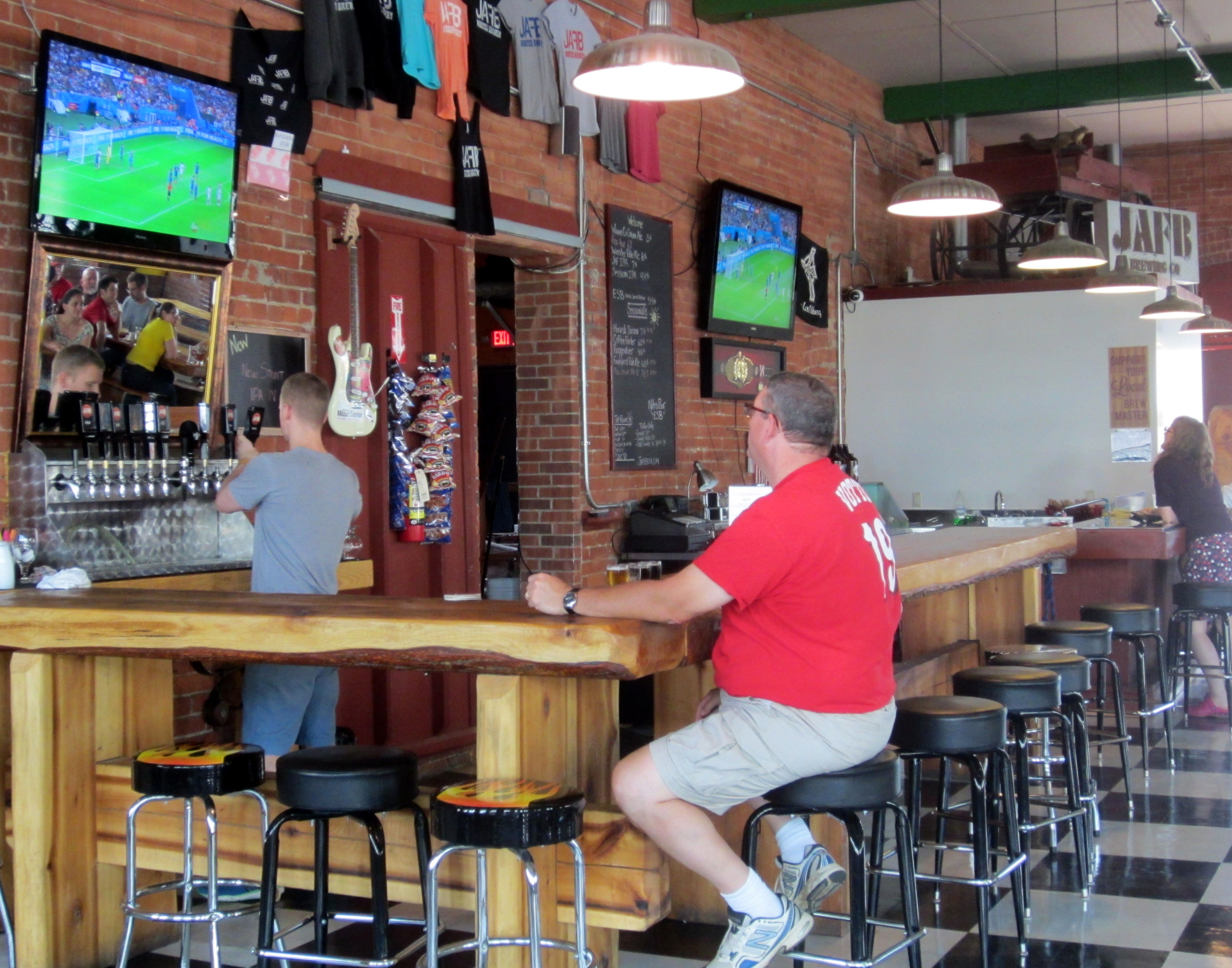 Having invested more hours over the past month than I care to admit watching the World Cup I found myself in a wooded patch of the Ohio countryside northeast of Mansfield as the championship match kicked off. I was with my friend Ralph and we had just dropped our daughters off at summer camp. What to do now? If we headed back to Columbus the match could be over before we arrived (unless of course the rules were changed so that they had to keep playing until Argentina scored). I’d done a bit of sketchy internet research on Mansfield, and the top attraction is the Ohio State Reformatory, an out of commission prison where the Shawshank Redemption was filmed. A fascinating place I’m sure, but not high on my list of ideal places to watch a sporting event. So as is often the case I suggested that we head to the nearest brewery, which in this case turned out to be JAFB Wooster Brewing, which I will hereafter just call JAFB. There was no guarantee they would have a TV, but there was a 100% chance they would have beer. It’s important to keep your priorities in perspective.