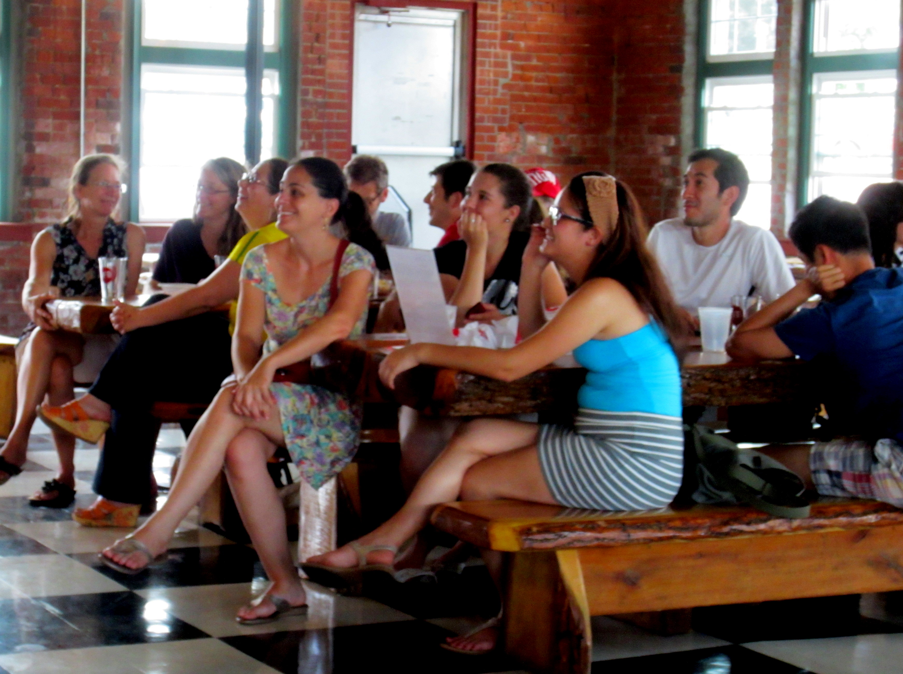 To be perfectly honest we had no idea what to expect, but on entering we were in for a pleasant surprise. The brewery is set in a spacious, open room filled with attractive handmade wooden communal tables. Sunlight was spilling in from the windows that surround the bar area, and the floor was tiled with large black and white squares just waiting for someone to play out a chess match with life size pieces. Most importantly for us there were several big screen TVs mounted to the red brick walls and they were broadcasting the championship match with the volume turned up. There were about 20-30 people spread over a couple of the long tables watching the match. Most of the patrons were following the game closely, but it did not seem to be a particularly partisan crowd. Ralph and I took a seat at the bar and commenced with the grueling task of drinking beer and watching soccer.