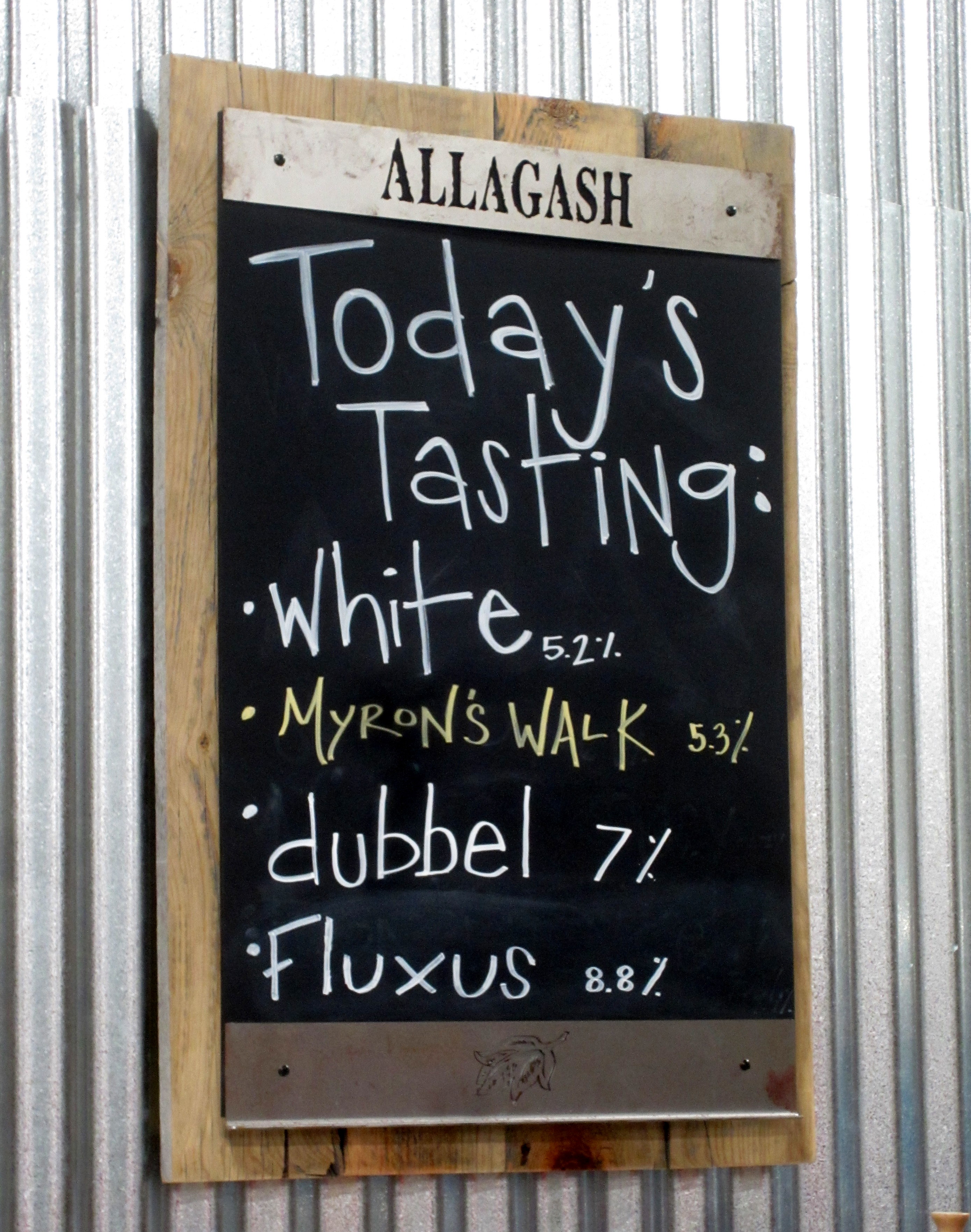 The “oak barrel room” is where the tasting part of the tour takes place.  Everyone was given an Allagash chalice (not to take home though) and for the next 20 minutes or so we sequentially sampled four Allagash beers.  On the day we toured the beers on offer were White, Myron’s Walk (a collaboration with Sierra Nevada), Dubbel, and Fluxus, all of which are described in more detail in the next section.  You get roughly 3-4 ounces of each beer.  Unfortunately, the tour did not include a stop at the coolship, but in talking to the guide I learned that they are only able to use the coolship in late fall because that is the only time the yeast in the Portland air are appropriate for making good sour beer.  He said they had also tried using the coolship in the early spring, like they do in Brussels, but the results were not up to their standards.