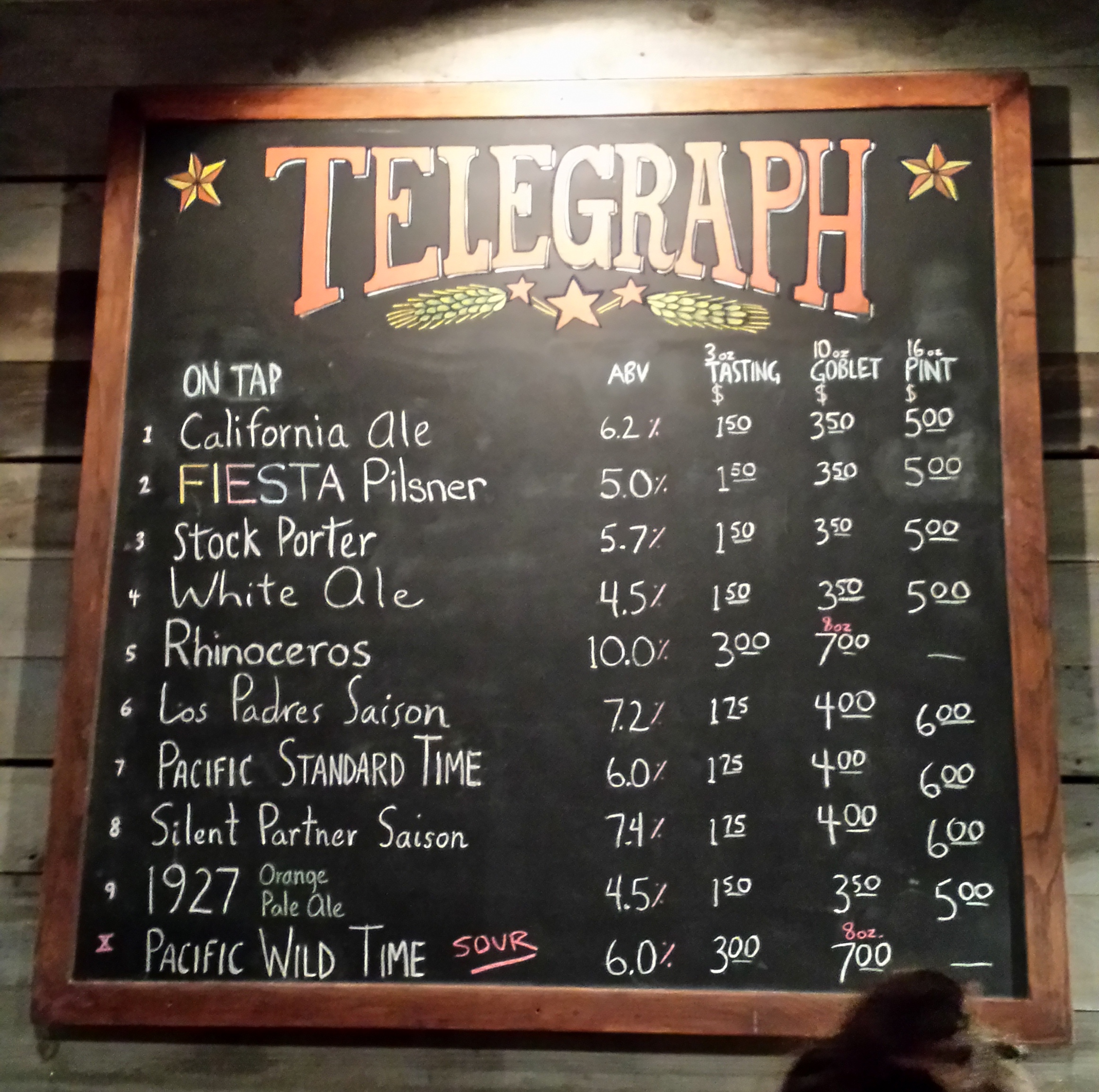 Like the Brewhouse, Telegraph allows you to order any beer you want in a sample size tasting glass. The prices are $1.50-$1.75 per beer, except for the sours and high abv beers which are $3.00. We didn’t have a bad beer at Telegraph, and several were exceptionally good. The California Ale is a 6.2% abv Belgian style ale that has a nice spicy hop profile, fruity highlights from what I’m guessing is a saison yeast strain, and a crisp dry finish. It’s taken home both gold (2011) and bronze (2013) medals from the Great American Beer Festival. Another decorated beer (silver medals from both the GABF and the World Beer Cup) is the Rhinoceros Ryewine, which drinks like a big brother of the California Ale. Spicy notes from the rye, hops, and yeast converge in a beer that is ridiculously easy drinking and dry for 10% abv. It’s best to stick with the small pours of that one. Perhaps my favorite was the Pacific Wild Time, an American Wild ale made by aging their Belgian Pale Ale (Pacific Standard Time) in wine barrels with lactobaccillus. It was nicely tart and crisp, but not over the top sour, with oak notes from the barrel aging, a refreshing beer for a hot day. For those a little less adventurous the 1927 Orange Pale Ale is a good choice. According to the bartender it is made with 50 pounds of oranges per batch. While that might sound like it would lead to a wine cooler like fruit beer, the result is actually an easy drinking ale with a nicely restrained orange flavor.