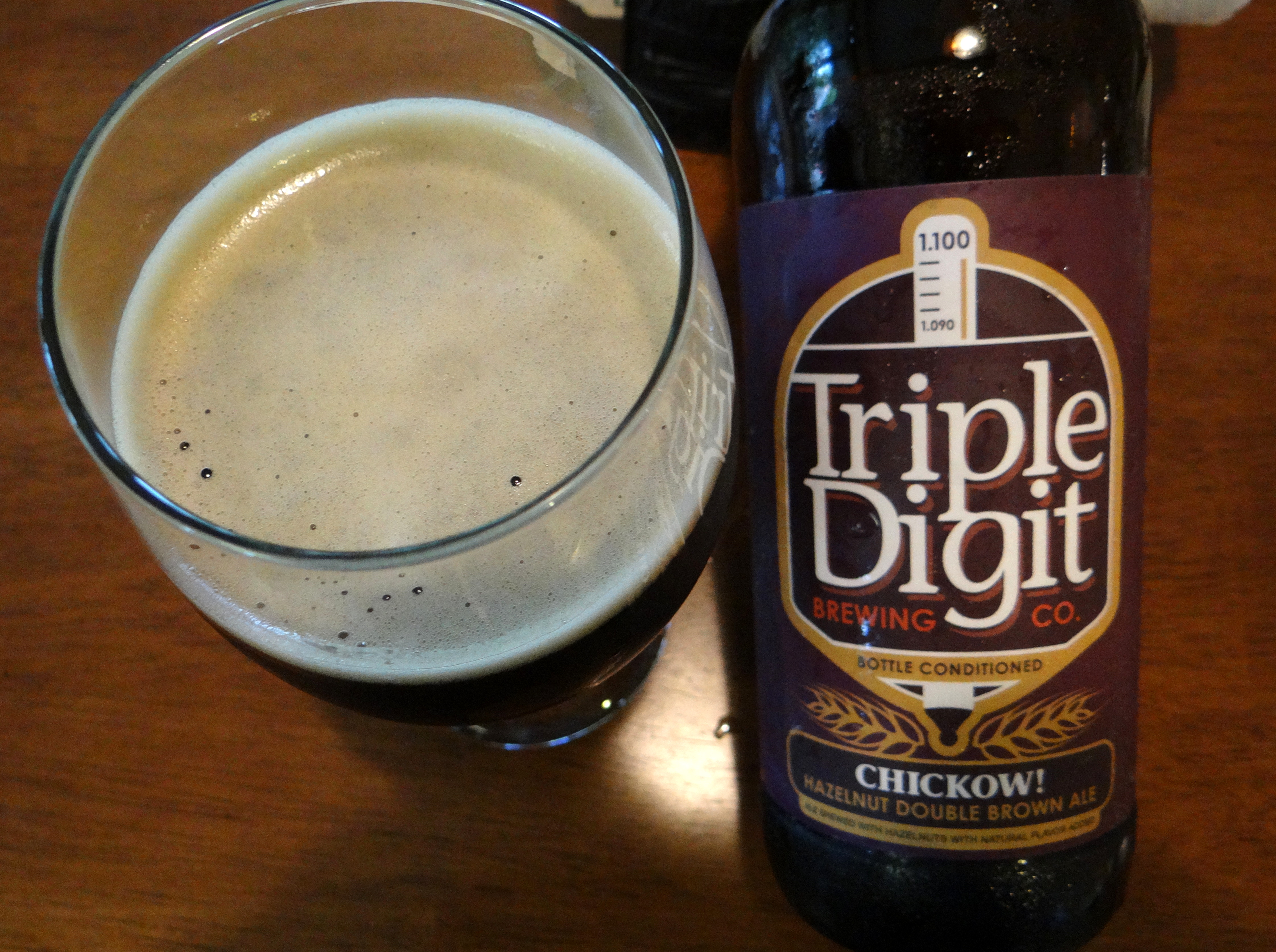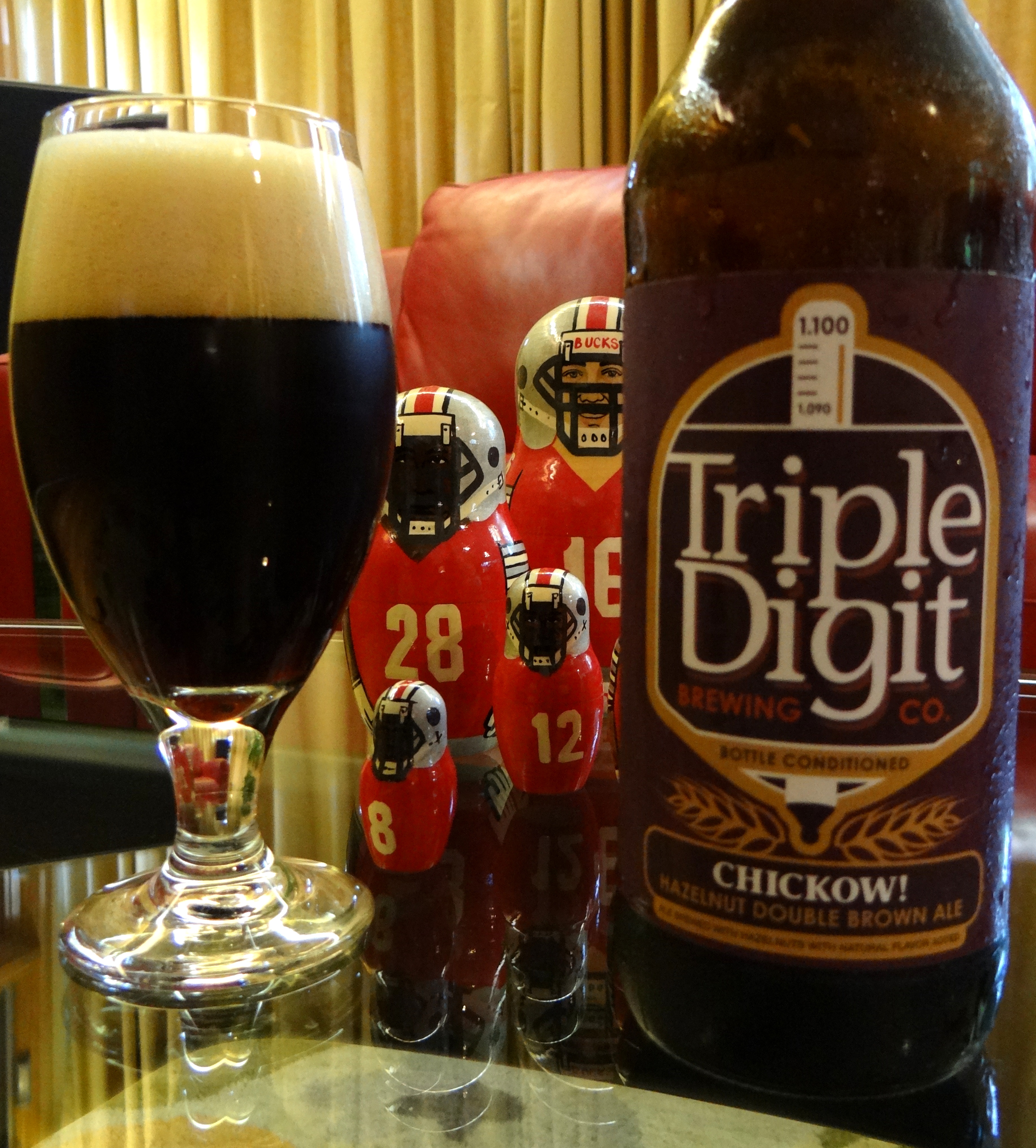 Since a buckeye is nothing more than a nut (the English call them horse chestnuts) another way to show your team pride would be to opt for a nut brown ale. So for the home opener I decided to crack open an Ohio beer that has been waiting patiently in my refrigerator since my wife brought a bottle home from Cincinnati last February—Chickow! a hazelnut double brown ale by Triple Digit Brewing in Cincinnati. What better occasion than a football game for a beer that packs a 10% abv punch and is brash enough to end its name with an exclamation point. (Editors Note: From what I can tell Triple Digit and Listermann are one and the same brewery. They release the beers with >10% abv under the Triple Digit label.)