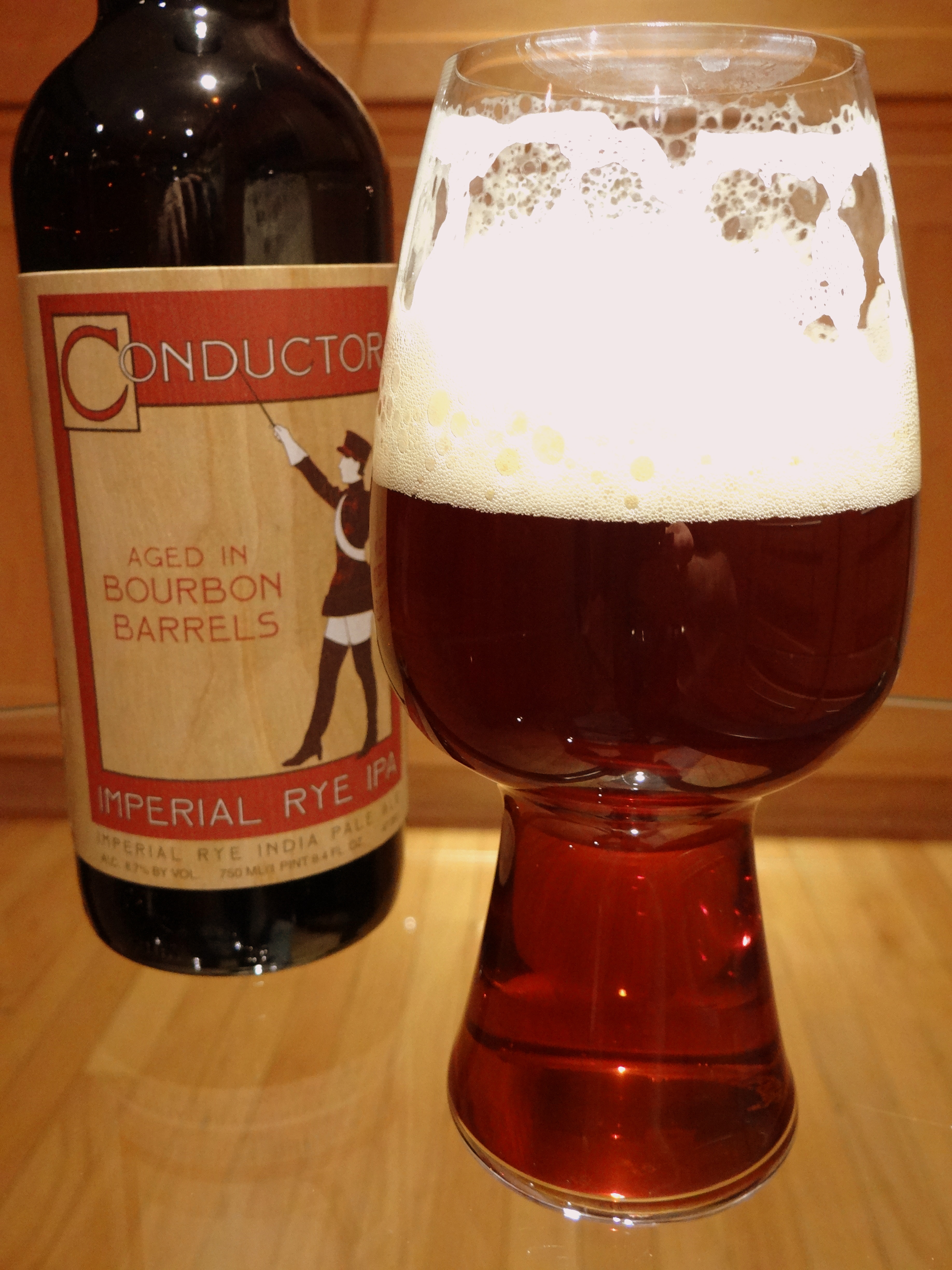 One of my goals for the holiday season is to reduce the inventory of my beer fridge and cellar. It’s a little like those year end sales that stores put on, out with the old to make room for the new. The holidays provide an opportunity to open up some of the bigger beers that come in large bottle format. One bottle that I’ve been itching to open up for a while is a 750 mL bottle of Actual’s Conductor Imperial Rye IPA aged in bourbon barrels.