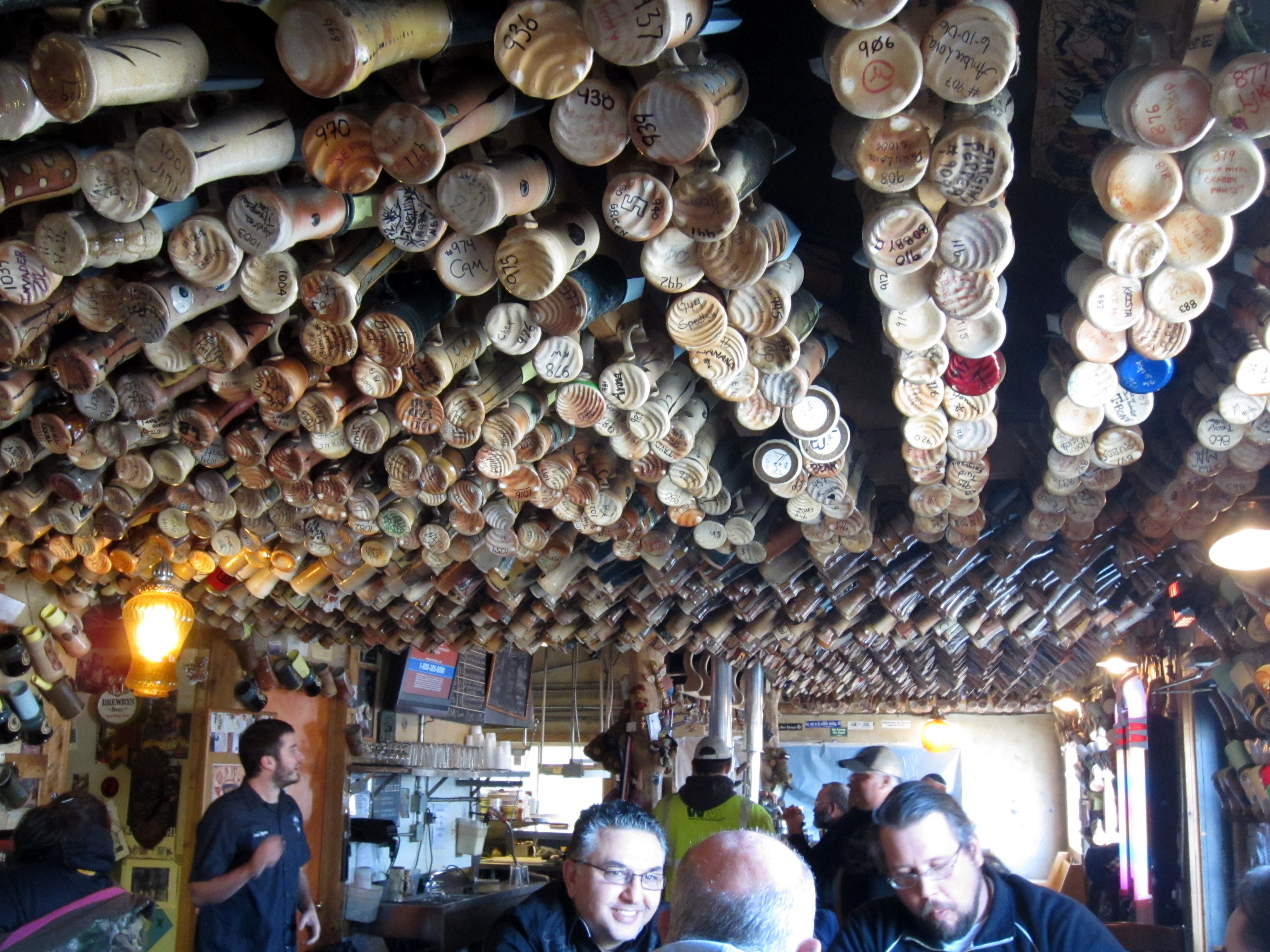I visited the Dark Horse taproom in Marshall, Michigan twice last year and I can personally attest that no AC/DC songs were heard on either visit. I’m not privy to the musical tastes of the brewers at Dark Horse, but the fact that they make a beer called Rain in Blood (a pale ale made with blood oranges) in tribute to the speed metal band Slayer makes me think that you might also lose your money if you try to play a song by One Direction or Idina Menzel on the Dark Horse jukebox. Another notable feature of the taproom is the mug club. Every inch of the ceiling and a significant fraction of wall space is covered with individualized ceramic mugs that number over 3000. I guess this is what Pottery Barn would look like if it were run by tattooed, bearded, beer swilling nonconformists.