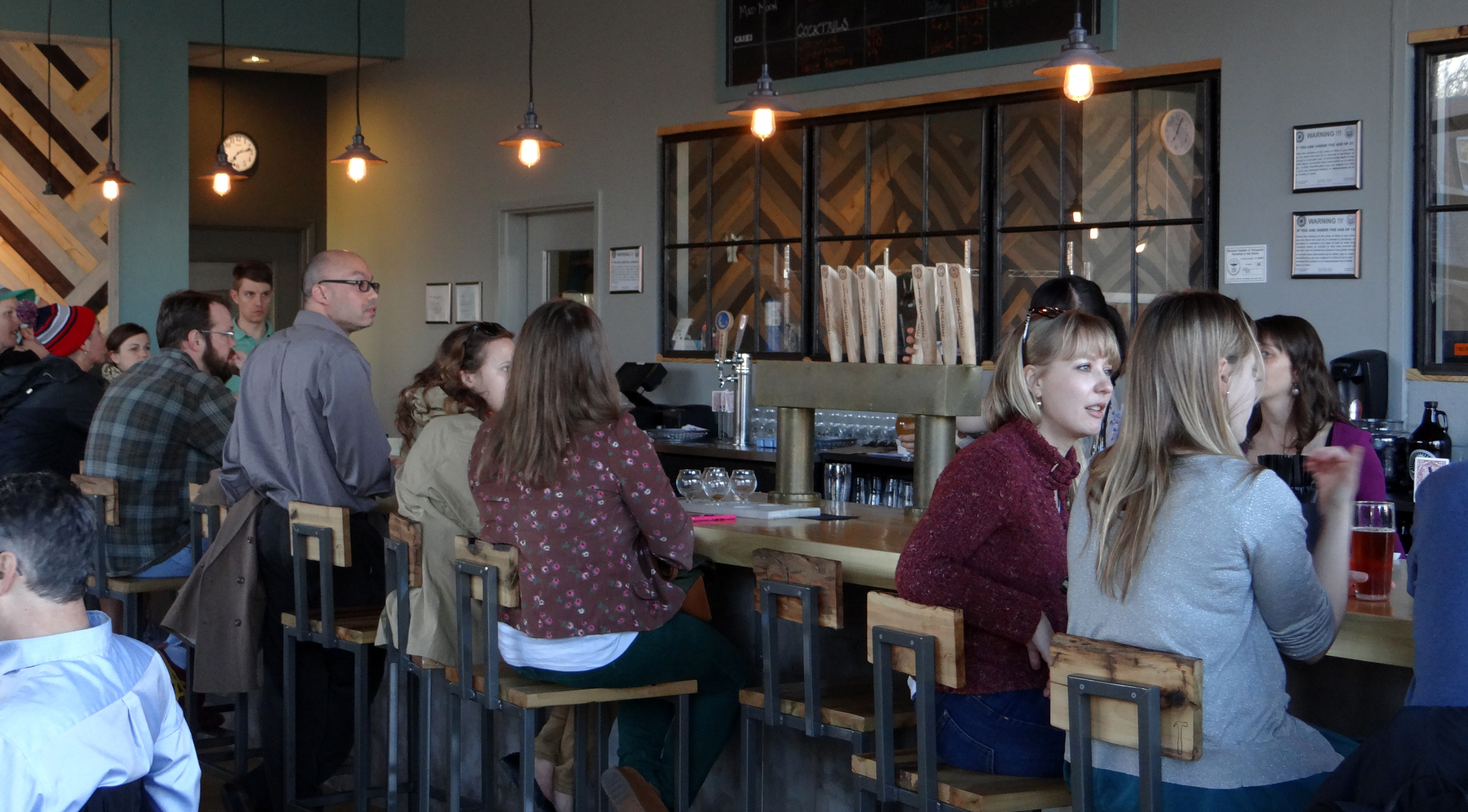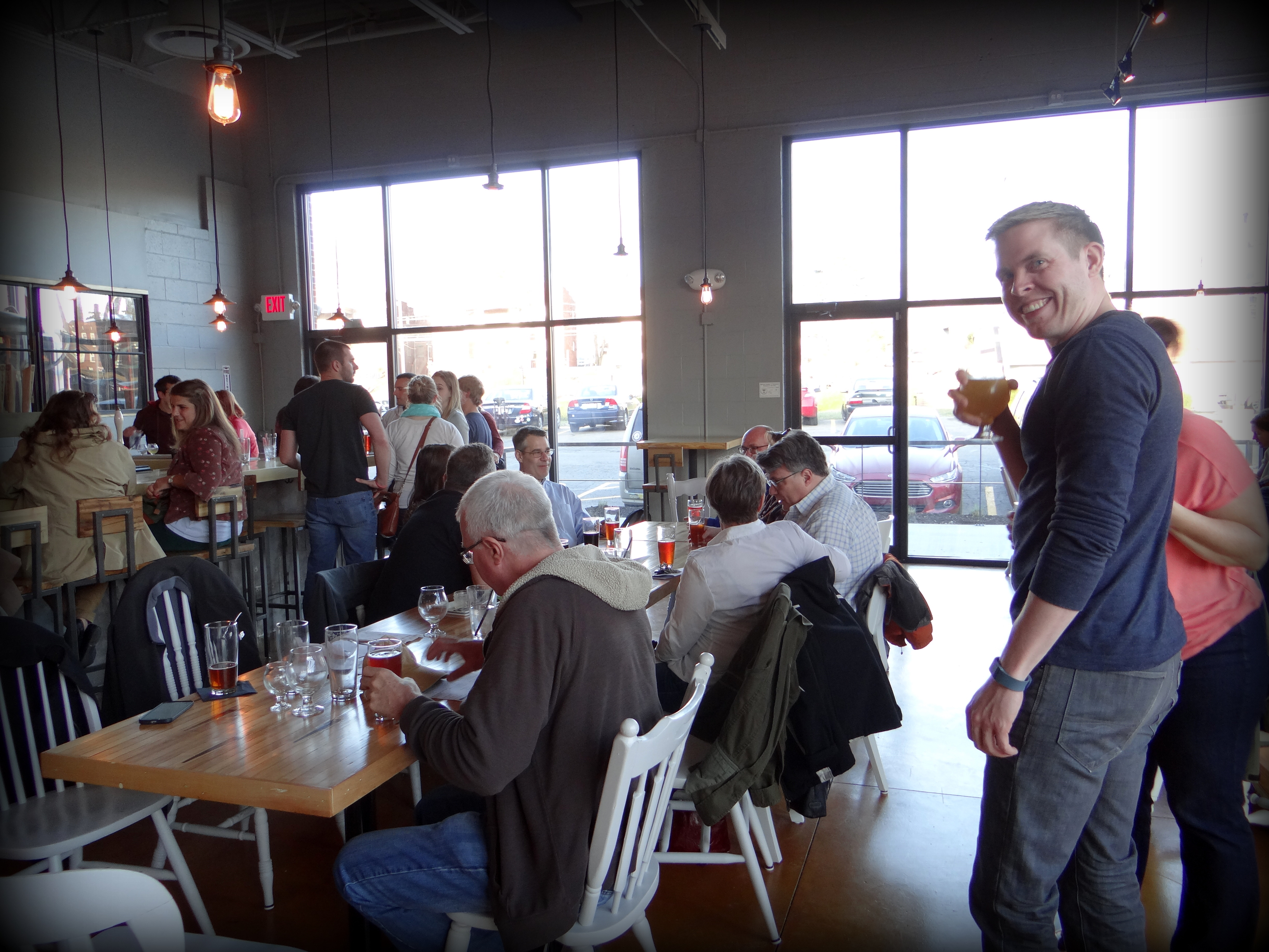 The bar/taproom area is more spacious that I was expecting. The east and south facing walls are full of windows, which as you can see in the pictures here makes for a bright, open space during daylight hours. Once the sun goes down the light comes from trendy Edison lights that hang from the ceiling. A colorful herringbone wood parquet pattern graces the back wall, and the tried and true chalkboard on the wall behind the bar advertises the beers on offer. There are no TVs to compete with the convivial conversation of the patrons. Even though my visit was on a Tuesday evening they drew a very respectable crowd.