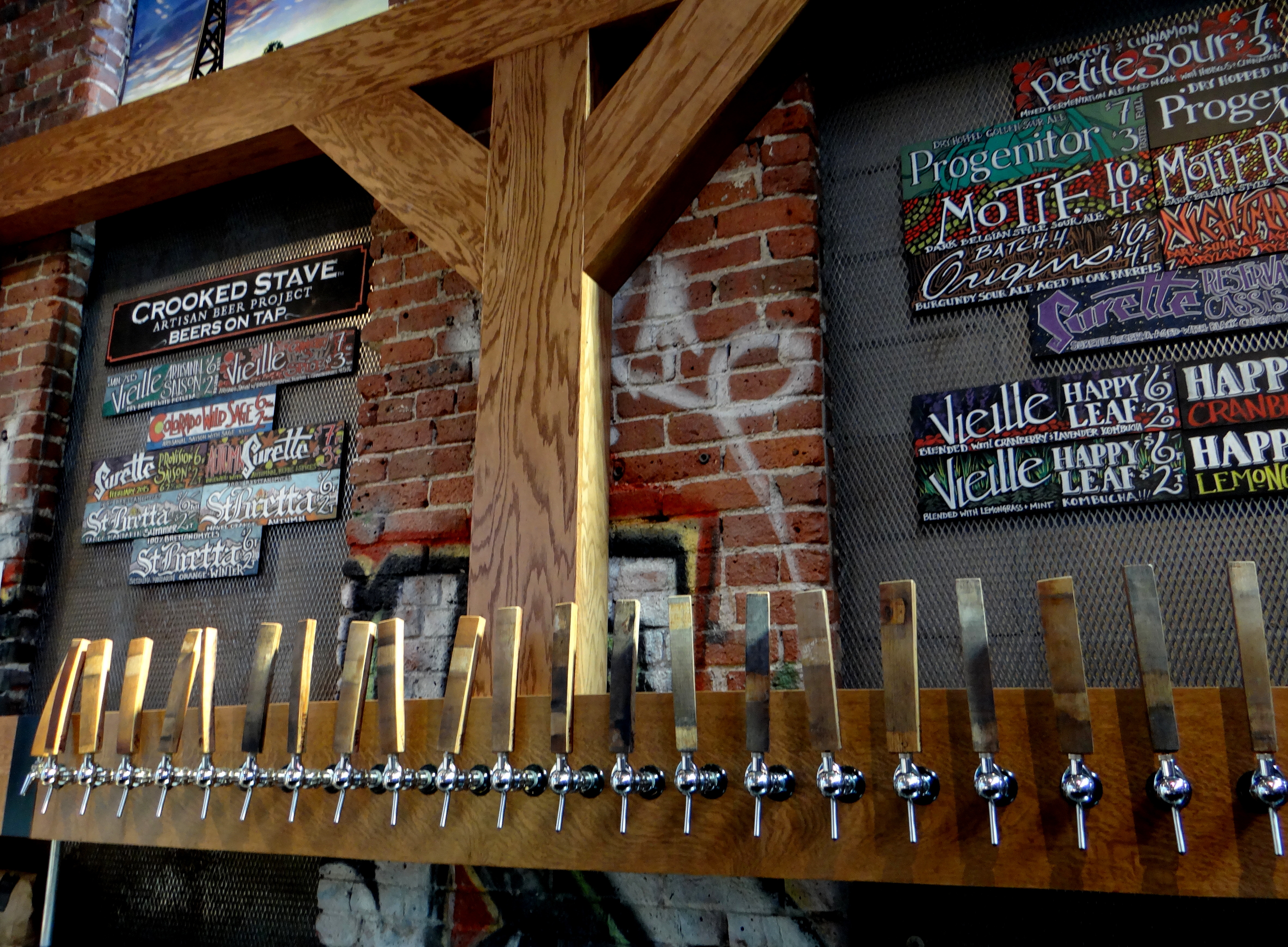 It’s just after 3 pm on a Friday when I arrive. There are already a dozen or so people there who have made their way to Crooked Stave for an early start on the weekend. I take a seat at the L-shaped bar, which occupies the back corner of the taproom. Sunlight is streaming through windows high above bathing the brick walls of the old foundry in a warm light. The bartender, whose name is Alex, is very knowledgeable and agrees to be my guide to the world of Crooked Stave. Over the next two hours I work my way through much of the taplist while Alex shares the back story behind each beer.