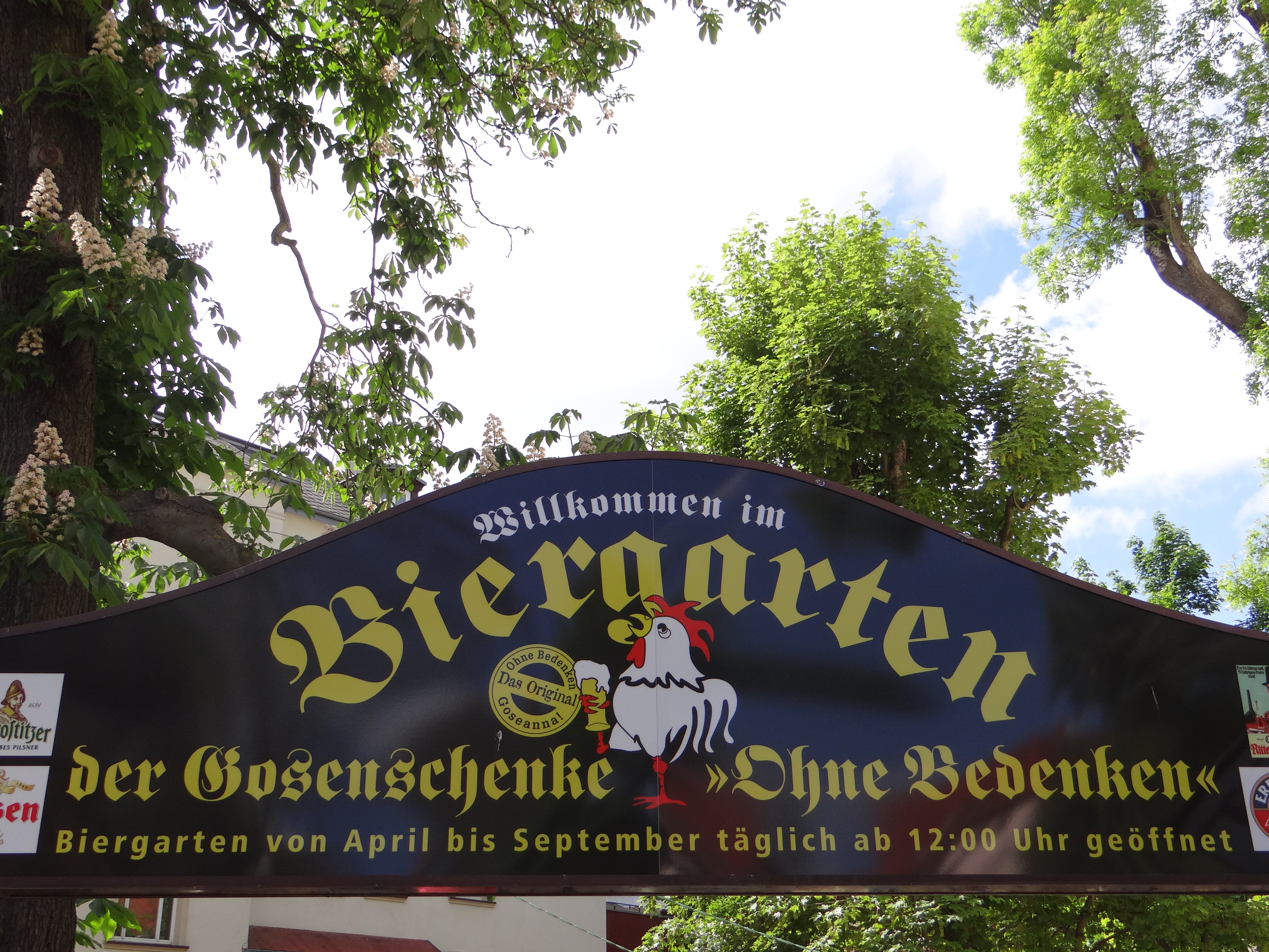 An ordinary visitor would probably start by heading to one of the historic sites mentioned above, but I headed straight for Ohne Bedenken Gosenschenke, the famous gose tavern where the style was first revived. The walk takes about 20-25 minutes from the main train station and cuts through affluent neighborhoods that lie northeast of the zoo. I arrive around 2 pm to find a large beer garden shaded by lofty trees located in back of a stylish multistory building with classical sensibilities.