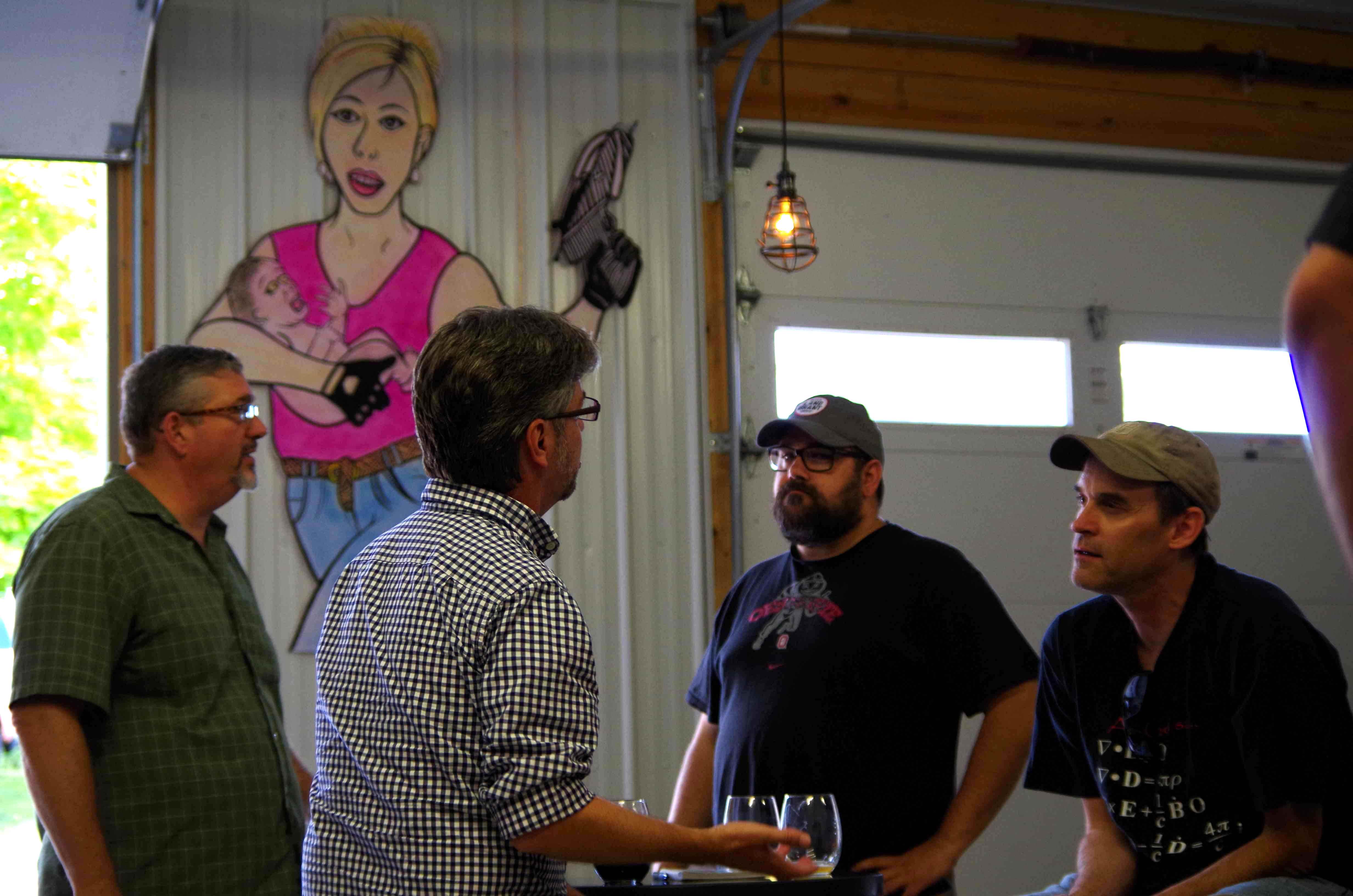 On any other property in Morrow County a building like this would be filled with farm equipment, but not this one. The first things that catch my eye are the shiny stainless steel mash tun, fermenters and brite tanks located smack dab in the center of the building. A newly constructed bar with seats for 9-10 people is located on the end closest to the entrance. Today they are pouring four beers—Crossing Swords, Musk of the Minotaur, South of Eleven, and Thudstaff. A handful of tables made out of empty wooden barrels and ringed by shop stools occupy the area between the bar and the brewing equipment. Large wooden cutouts of the disturbing subversive characters that spring from the mind of evil genius/art director Thom Lessner adorn the walls. The eyes of the phaser wielding, demon baby cradling, femme fatale from Mom Jeans Milk Stout seem to follow us at every turn.
