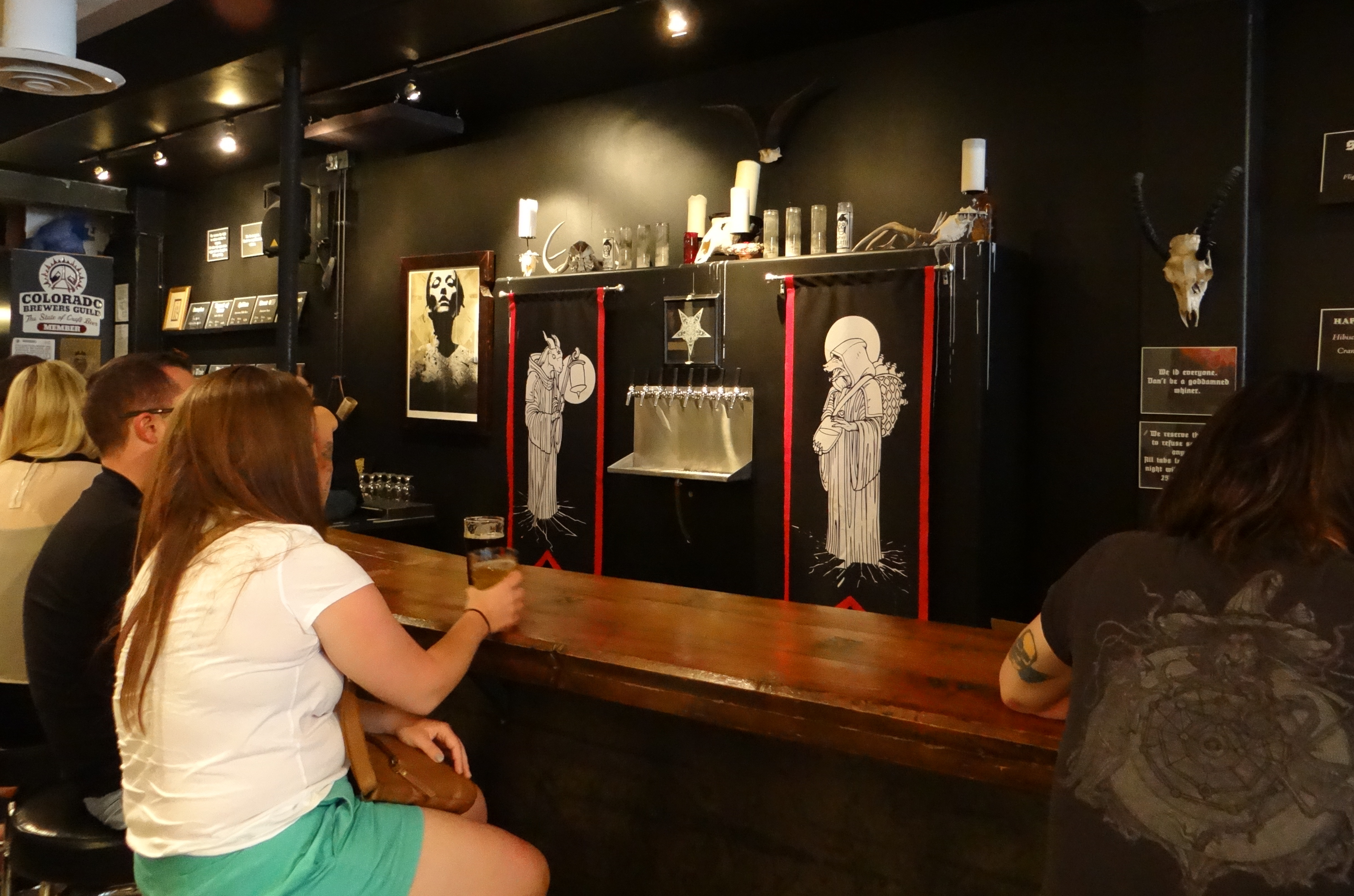 The taps are located immediately below a pentagram and flanked by painted images of lantern holding, robed figures of a dog and a goat. As advertised hard core metal music pulses in the background. You’re not likely to hear 80’s era hair metal here either, instead expect bands with names like Water Torture, Pallbearer, Yob, and Dead Congregation.