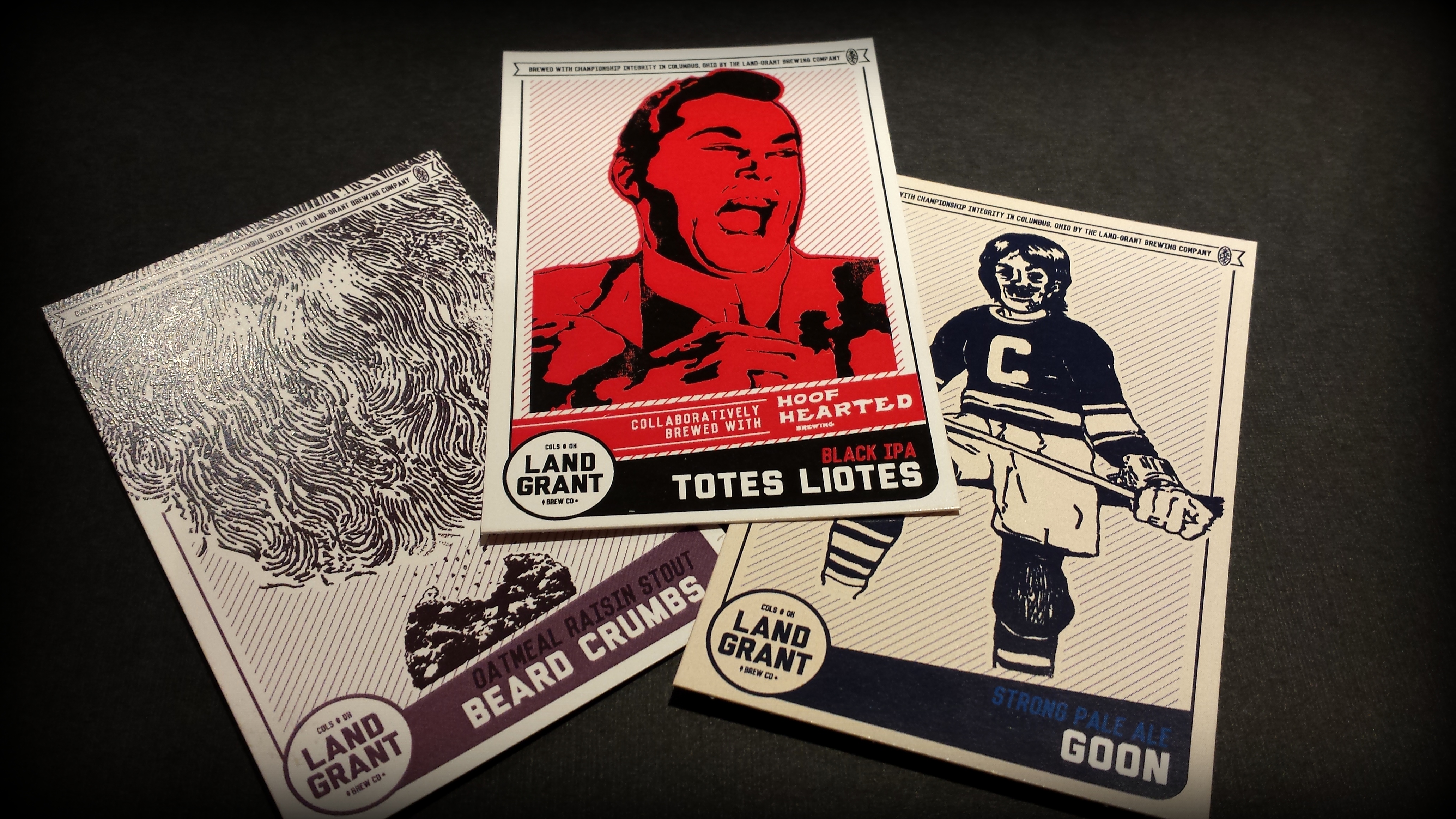 Goon (6.1% abv, 65 IBU) – This hockey-themed copper hued beer, billed a Strong American Pale Ale, is available only at Nationwide Arena and the Land Grant taproom. The nose is predominantly sweet caramel malts, with a subtle accent of floral hops. The aroma is suggestive of a marzen. Initially the taste follows suit, but before you get comfortable an aggressive punch of piney, bitter hops slaps your taste buds around and chases away any notions of a sweet cloying finish. The malt bill is rich and nuanced with Pale Ale, Munich, Carapils, Crystal Rye and honey, but the hops (Magnum, Northern Brewer, Chinook and Green Bullet) are as unrefined as the name. The end result is an unexpected stalemate where neither malts nor hops get the upper hand. Blue Jackets fans looking to numb the pain of a disastrous start to the 2015-2016 campaign can find this on tap at six different beer stations at Nationwide Arena starting this week and running throughout the season.