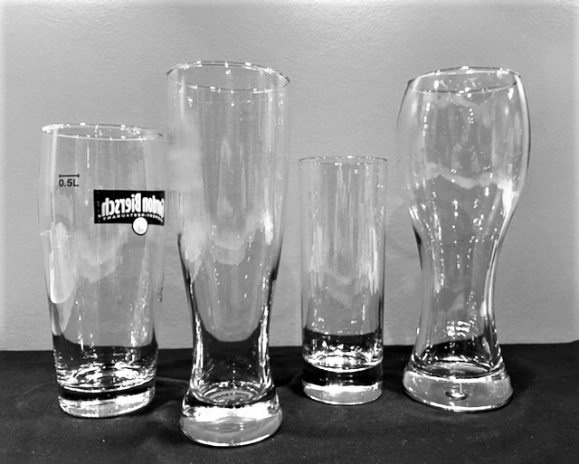 German glasses from left-to-right: Willi Becher, pilsner glass, stange, and weissbier vase.
