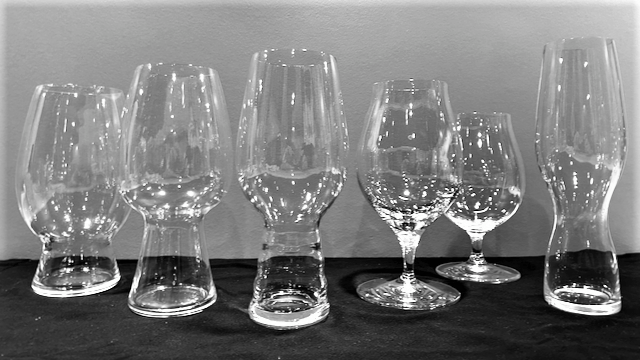 Spiegelau glasses from left-to-right: wheat beer glass, stout glass, IPA glass, barrel-aged glass, beer tulip glass, and craft pils glass.