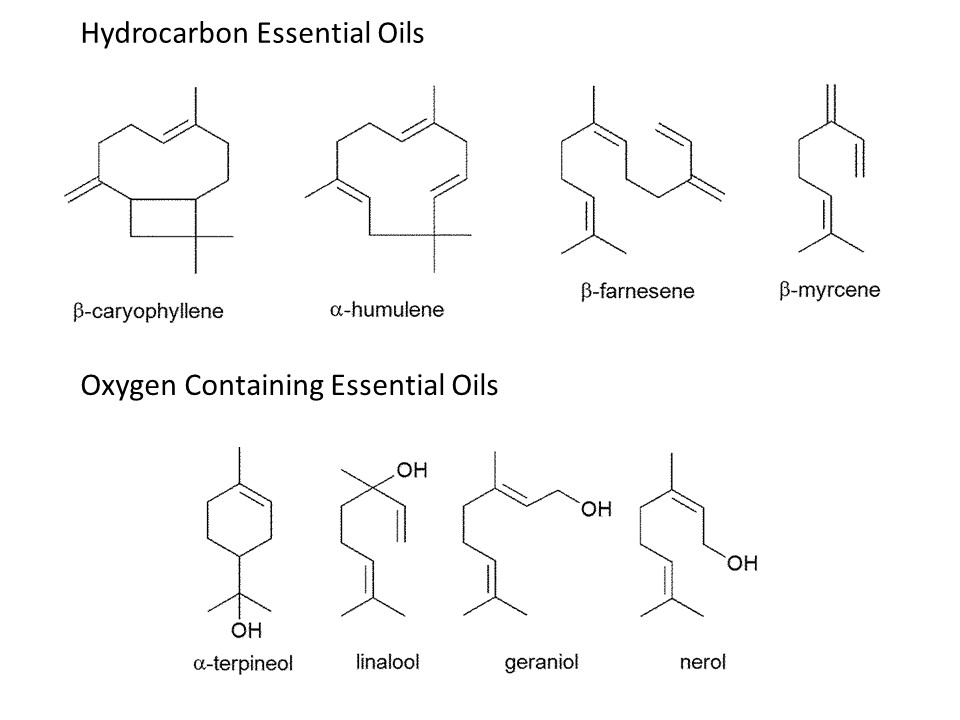 The most prevalent compounds in the hydrocarbon fraction of the essential oils (listed in order of decreasing concentration) are myrcene, humulene, caryophyllene, pinene, and farnesene. These molecules are most closely associated with the aromas of trees and other woody, herbaceous plants. To understand them better let’s pull some descriptions from Harold McGee’s book, “Nose Dive – A Field Guide to the World’s Smells”