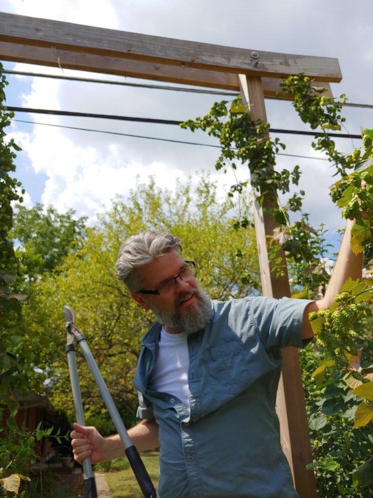 If you are reading this article chances are your skills at growing hops might be more similar to me than to commercial growers like the Zachrichs. So I will close with my own, somewhat limited experiences at growing hops. In the spring of 2019, I planted two Cascade rhizomes and one Centennial rhizome on the east side of a smallish mound in my front yard. Shortly thereafter I built simple frame upon which I could run cords to trellis my hops, anchored by two 12’ 4×4 posts. Taking advantage of the elevation gain of the hill I’d estimate that my hops can climb about 14 feet or so.