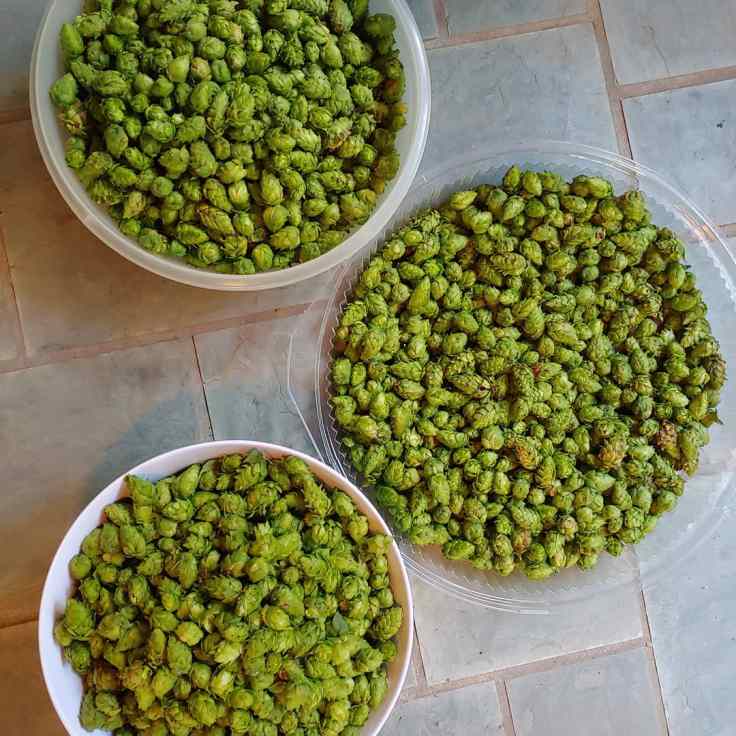 Our harvest typically begins the last week of July and finishes by the third week of August. Hop harvest timing is critical to the quality for optimum acid levels. The moisture content of the hops is the determining factor which can be tricky for a backyard grower. A grower with a single bine would be sacrificing a significant amount to get an accurate measurement. While the optimum dry matter range is variety dependent, most should be harvested at 20-25% dry matter. Cones will not all be consistently the same exact moisture even on the same bine so the determination of when to harvest is somewhat of an average.