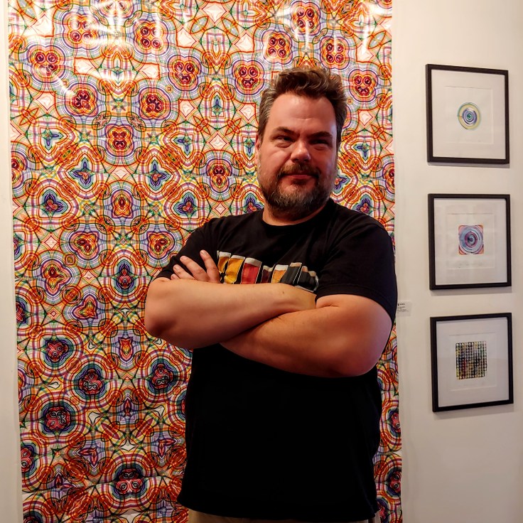 Our companion and guide for this leg of the trip, Chris Mercerhill, is the featured artist at Gallery 202 through September 5, 2022. As an artist, Chris is best known for his photo quilts. To create these Chris takes photographs (printed on photo paper like in the old days), cuts them into various geometrical patterns, and sews them together into a quilt, resulting in a unique art form. In fact, a Mercerhill-commissioned photoquilt, depicting family travels in Europe, adorns a wall in my living room. For this exhibit Chris branched out in a new direction he calls generative art. In short, Chris programs a robot to draw various patterns, but he embeds an element of randomness in the program. Design elements such as the colors used, the choice of shape (circles, squares, diamonds, etc.), and/or the location of those shapes are all chosen using probabilities. Chris doesn’t know exactly what the painting is going to look like until the robot finishes. This is a blog about beer not art, but I would encourage you to check out Chris’ art on either his website or for the most up to date images his Instagram account.