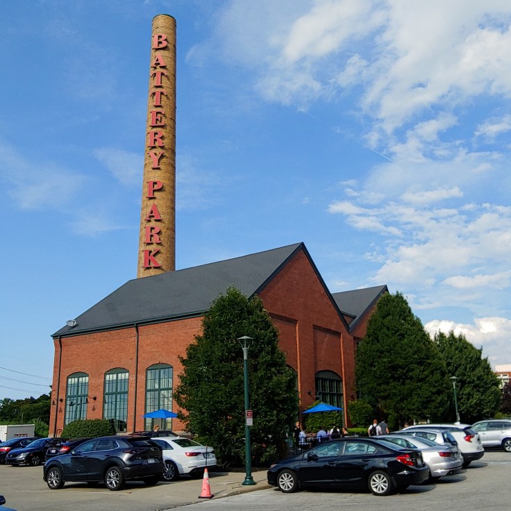 Terrestrial is housed in an old industrial building featuring an imposing brick smokestack. There are large red letters running vertically down the smokestack that spell out Battery Park. I later learned the neighborhood is called Battery Park, because this is where the alkaline battery was invented in 1957. At the time the facility was owned by Union Carbide, but later it became Eveready, and eventually Energizer. I didn’t realize I was about to have a beer in building where such an important invention was made and sadly Terrestrial does not advertise this interesting aspect of their location. Maybe they should consider beer names based on alliterations of battery terms (Positive Potential Porter, Cathode Kölsch, …), or commission a statue of a pink bunny beating a drum, or build a battery powered electric fence around the patio to keep underage dogs out.