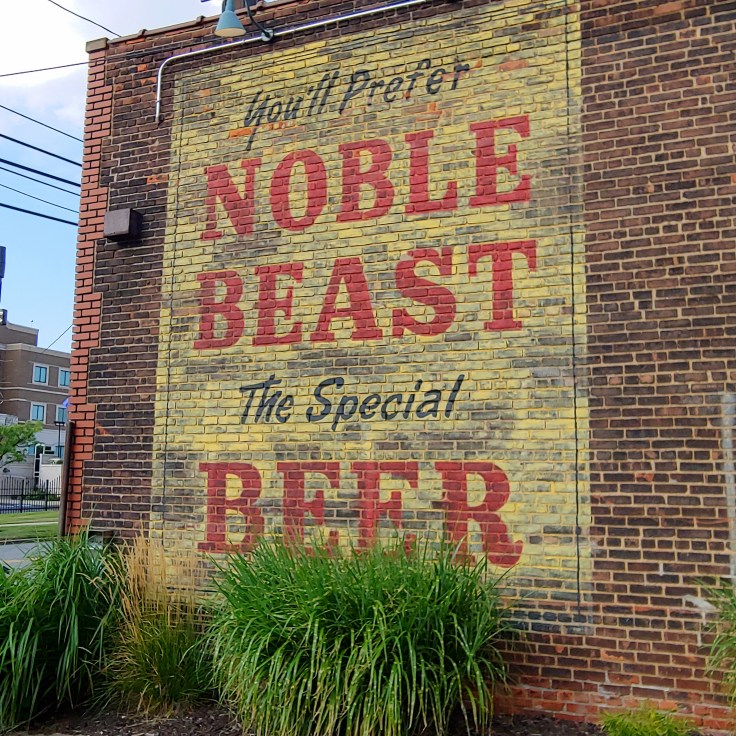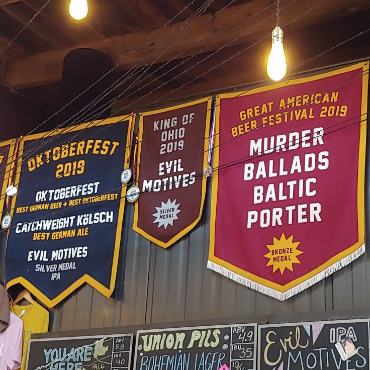 Noble Beast opened in 2017. The name is an amalgam of two different approaches to brewing. Noble is a nod to the delicate hops and the traditional beers of Europe, and Beast refers to the innovation and irreverence of American craft brewing. In keeping with the day’s theme it’s located in an old industrial building on Lakeside Avenue across from the FBI office. Upon entering I’m immediately impressed with the vibe. The rustic character of the building comes through in spades. The feel is neither chic nor dilapidated, describing the space as comfy yet eclectic come closer to the mark. The layout is very open with a long bar on the right and the brewing equipment on the left. Green plants hang down from a rectangular skylight in the center of the taproom. Sun from the skylight diffuses the space with ambient light. Felt banners, like you might see at a high school gymnasium, hang behind the bar celebrating past triumphs at various beer competitions. I’m happy to see a banner commemorating a 2nd place finish for Evil Motives IPA at the 2019 King of Ohio contest (a competition I helped launch, organize, and judge for several years, although Rick Armon deserves most of the credit for the King of Ohio competitions). It hangs next to a deservedly much larger banner celebrating a bronze medal for Murder Ballads Baltic Porter at the 2019 GABF.