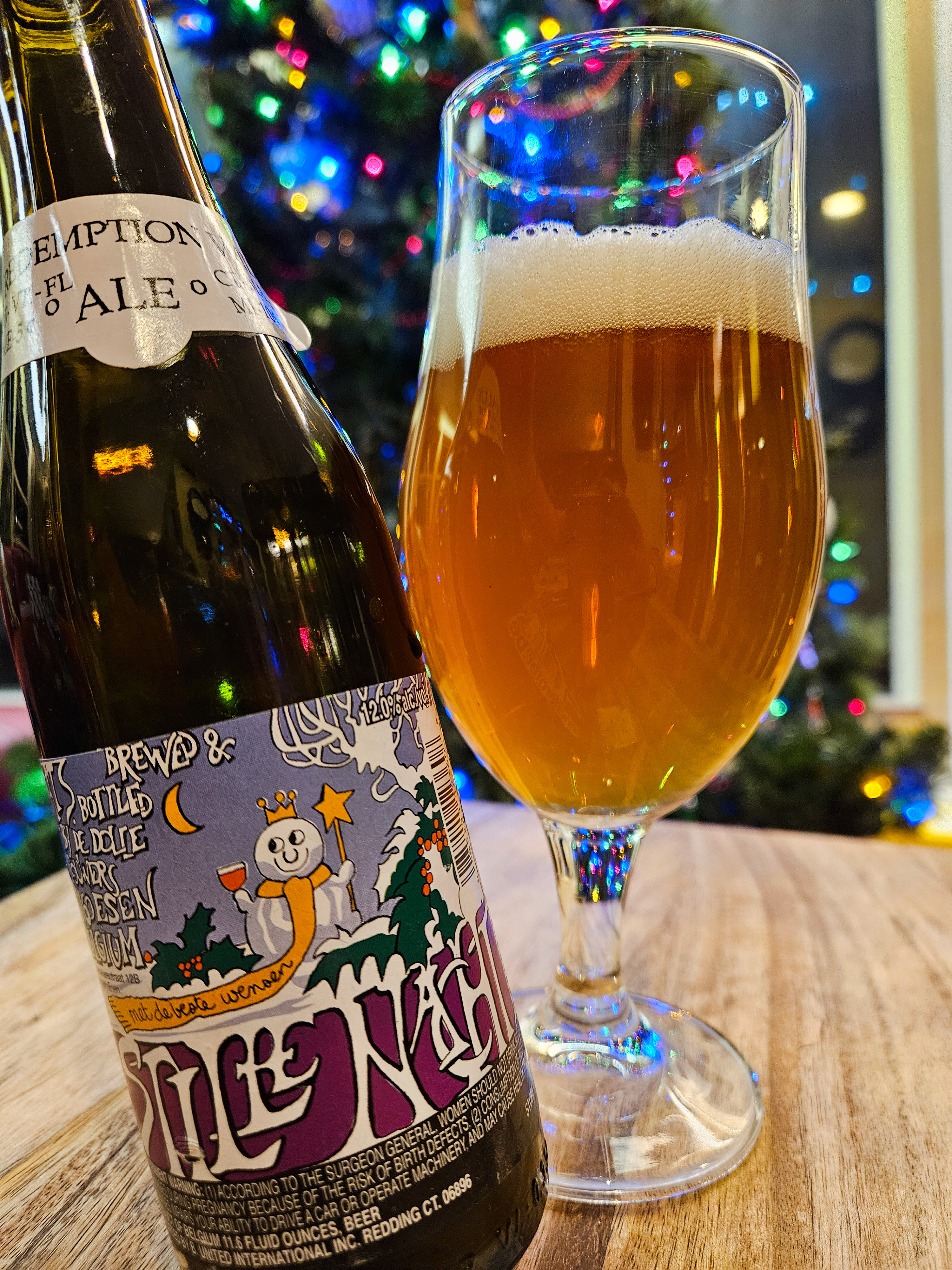 Wow! I can honestly say I’ve never tasted a beer quite like Stille Nacht. The honeyed character of the malts and the stone fruit esters from the yeast really complement one aother. The phenols are not overpowering, which is not something to be taken lightly for such a yeast-forward beer. It somehow manages to combine the intense sweetness that you might expect from a barleywine with a clean almost dry finish. On top of this already full palate of flavors, the mad brewers throw in subtle but unmistakable acidity that takes the beer in an entirely different direction than any Christmas Ale I’ve tried. For some people that last addition may be a step too far. Speaking for myself, I found the flavors to be too much for my uninitiated palate at the beginning of the glass, but by the end I was really getting into it. This is a truly unique beer, one worth treating yourself to around the holidays.