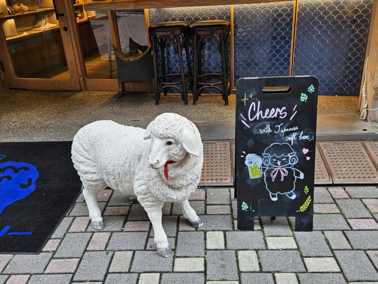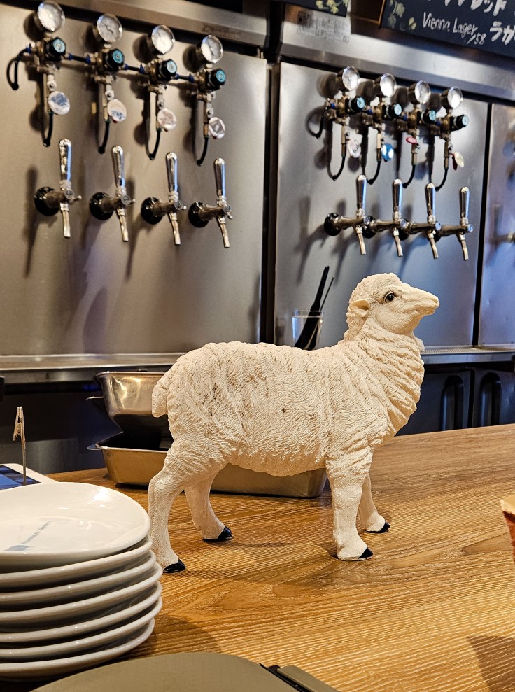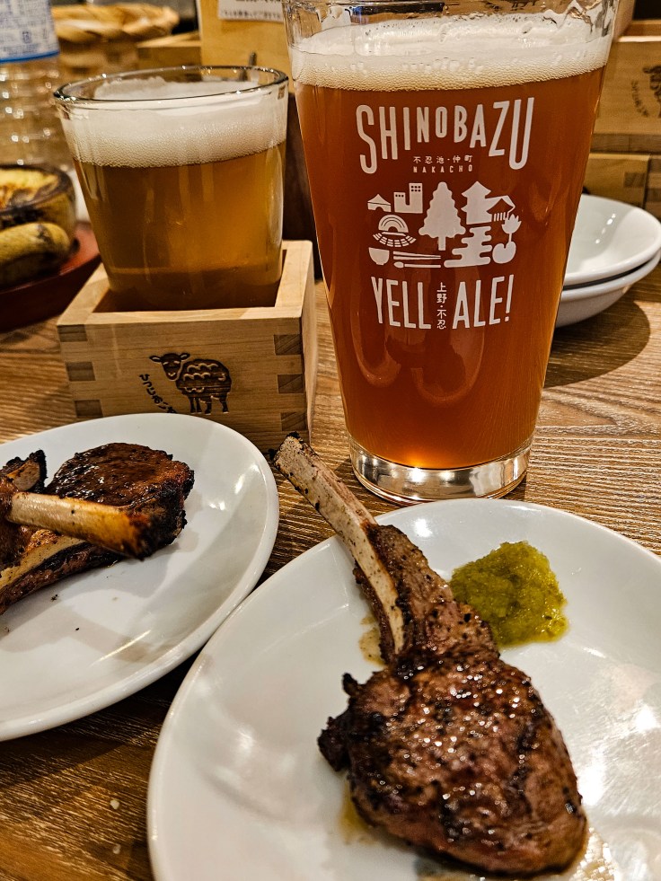 Our first stop, Shinobazu Brewery Hitsujiaisu, is a short walk from the southern end of the park. On the way there you can stroll by Shinobazu Pond, which lends its name to the brewery. The expansive pond is notable for being filled with lotus plants. I’m told they bloom from mid-June through August, and if you are lucky enough to visit during that time you should experience a beautiful view as partial compensation for the oppressive heat and humidity that comes with summer across much of Japan. The brewery was founded in late 2021 by Hiromi Maekawa, who wanted to combine his love of nearby Shinobazu Pond and all things sheep. In fact, hitsuji is Japanese for sheep and I believe hitsujiaisu means love of sheep (which takes a different meaning in some cultures, no offense New Zealanders). The beers here won’t knock your socks off but they are solid. The two flagship beers are a pale ale called Sheep Ale and a hazy IPA called YELL ALE! When I visited there were an additional four house brewed selections on tap, including a well-executed pilsner and Vienna lager. Confusingly the pale ale is lighter in color and hazier than the hazy IPA. For the first round my wife and I ordered the two flagship beers and when the bartender served us we assumed he switched our order. When my wife ordered another hazy IPA (YELL ALE!) we learned that our assumption was wrong. For what it’s worth, we both preferred the Sheep Ale, which features ample amounts of Mosaic and Nelson Sauvin hops. The inclusion of New Zealand hops is appropriate for the food that follows.