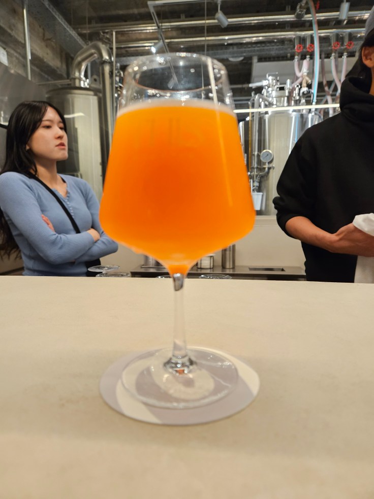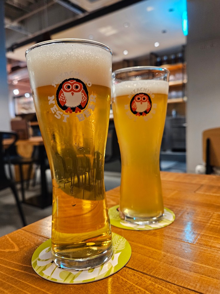 This outpost of Hitachino Brewing showcases their more recent expansion into distilled spirits, namely whiskey and gin. The taproom features a small still and there is an entire showcase for various whiskeys and gins made by the brewery. While whiskey is made exclusively at the main brewery in Ibaraki Prefecture, they do make some gin at this location. Intriguing, but I was content to stick with beer, so I ordered a glass of Nipponia 2025, a beer made entirely from Japanese ingredients. The grain bill consists of Kaneko Golden malt and Yamadanishiki rice, while the hops are two Japanese varietals, Sorachi Ace and Ibuki. I’d really wanted to love this beer, but I have to say that I’m not terribly fond of Japanese hops. When visiting Hokkaido, where Japanese hops are grown, I tried a couple of beers made entirely from Japanese ingredients and I had a similar take. I don’t mind a bit of Sorachi Ace as an accent note, but it doesn’t quite work for me when it has to carry most of the load. You may well have different taste preferences than I do, so don’t let me dissuade you from ordering a Nipponia, but if you want to try something else there are a lot of great options on the menu. In my opinion this brewery is one of the best at integrating Japanese ingredients into classic beer styles.