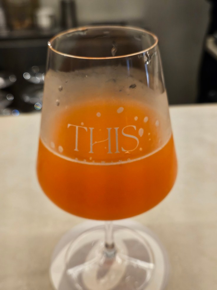 On the evening I visited there were eight beers on tap, with names such as this pale ale, this saison w/ chamomile and lemon, this wit w/ lime and cardamom, this hazy IPA, etc. They had two sours on offer, one with raspberries and one with carrots. The choice for a first beer wasn’t difficult; how often do you get a chance to try a carrot beer? Just to be clear, I’m not suggesting that more breweries should start adding random garden vegetables to their beers, but if you have any sense of adventure how could you not order the carrot ale? The orange-hued beer, no doubt brimming with beta-carotene, was served in an elegant Teku glass (it seems that all of the beers are served in this distinctive glassware). It was surprisingly delightful—tart but not too sour, with a distinctive carrot note that blends nicely with the base beer.