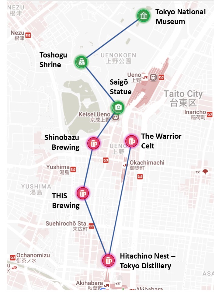 By this point you might be hitting your stride. If so, you could keep going with 4% pints of bitter or stout while waiting for the live music to start (no idea when that happens, but it seems to be a thing at the Warrior Celt. The bar is open until 5 am on the weekends). The wise move would be to get some more food, either here or at one of the many izakayas located in Ameyoka and then get some rest for another day out on the streets of Tokyo. In our next journey we’ll branch out to the neighborhoods of Asakusa and Sumida that lie just east of Ueno.