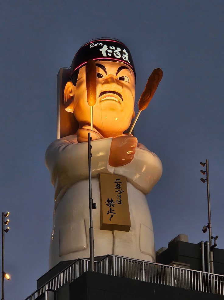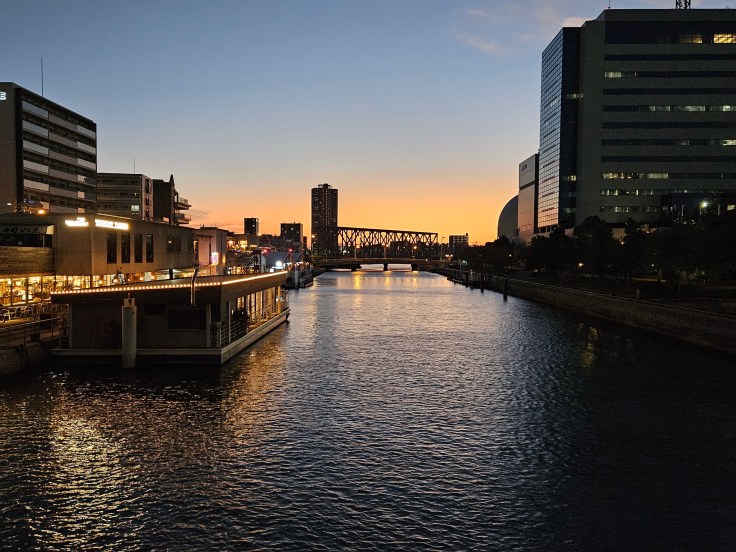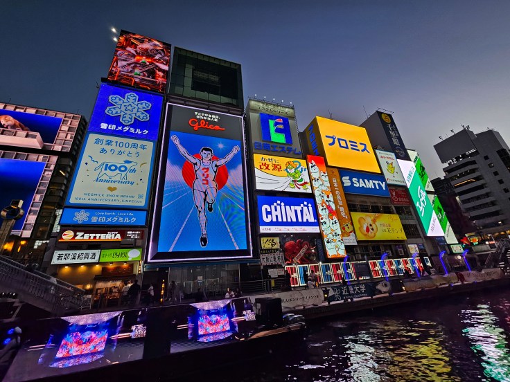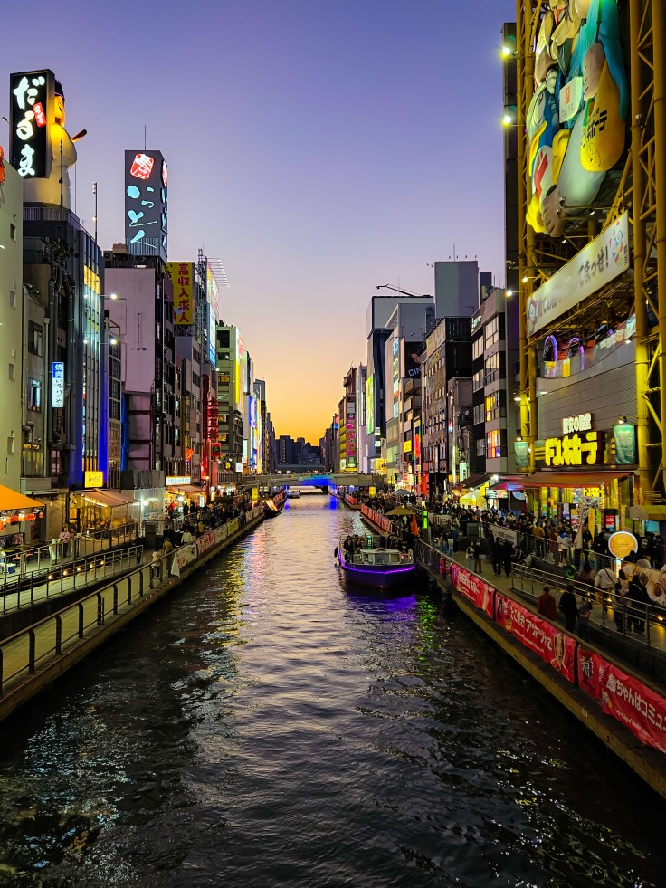 At the southern end of the Shinsaibashi shopping street is another iconic Osaka location, Dotonbori canal. The canal is lined on both sides by tall buildings lit with colorful neon signs (the Glico Running Man which dates to 1935 is the most famous). After surviving the Shinsaibashi Suji shopping street I’m thinking we should have traveled here on a boat directly from Tugboat Taisho. I have no idea how long that would take or how much it would cost, but apparently it is feasible. Our arrival coincides with the sunset and it does make for some pretty pictures. The combination of the canal and all the colorful signs makes for an image that seems distinctively Japanese.