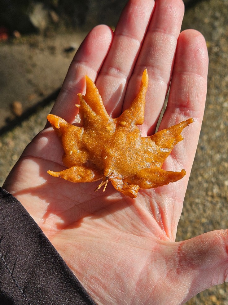As far as waterfalls go, Minoh Falls is decent, but it’s the things you see along the way that make the hike worthwhile. The trail goes by a picturesque Bhuddist temple (Ryuan-ji). For a small fee you can visit an insectarium, which is worth it for the butterfly exhibit alone. The park is known for monkeys and there are many signs warning you not to feed, approach, or trust the monkeys. Monkey mischief or monkey sightings of any kind were avoided during our hike. One of the most interesting diversions is a chance to eat deep fried maple leaves. This seems like taking seasonality a bit too far, but I have to say it makes for a surprisingly tasty treat. There’s not a lot to it beyond the deep-fried batter, but they have a pleasant crispy, crunchy texture and just the right level of sweetness.