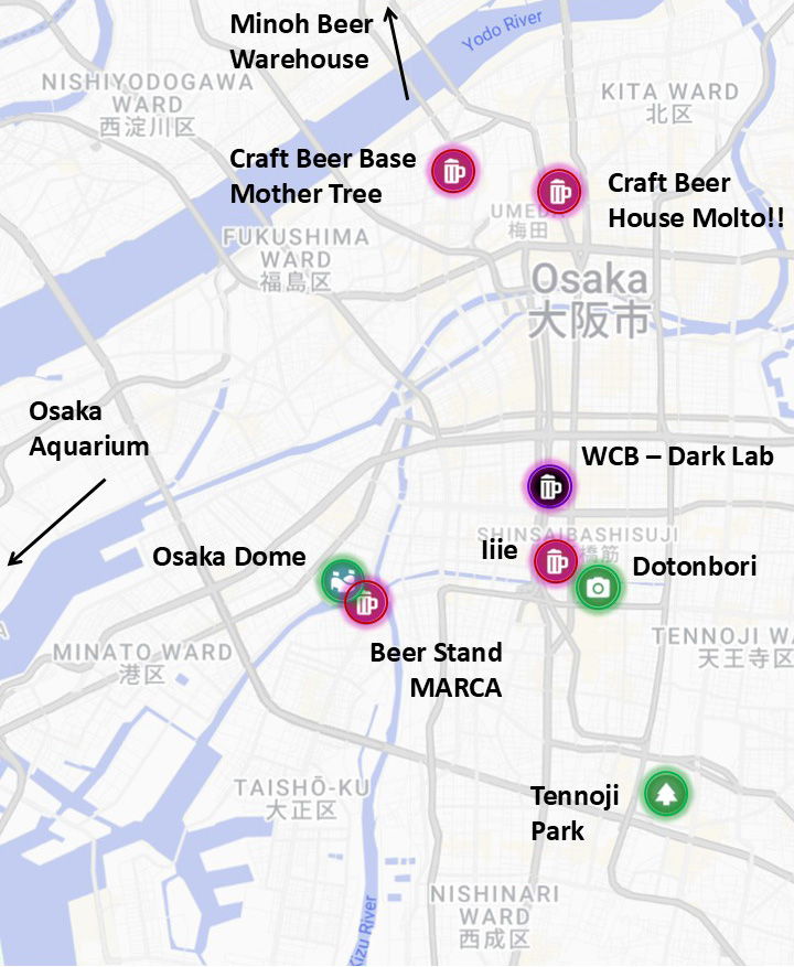 With a population of 2.8 million, Osaka is Japan’s third largest city, behind Tokyo and Yokohama. A visit to Osaka affords you the opportunity to drink craft beer in a former public bath/onsen (Kamigata Beer), in a skyscraper 31 floors above ground level (Craft Beer House Molto!!), on a tugboat (Beer Stand Marca), and myriad other places. Osaka puts on a 3-week Oktoberfest celebration at Tennoji Park in the autumn and a Belgian beer festival at Nakanoshima Park in the spring. I visited the former in late September and was really impressed with the selection of German beers on offer. Given the wealth of options, choosing an itinerary can be daunting to the first-time visitor. To aid in your planning, or if you simply want to experience Japan vicariously, here are some highlights from my recent weekend getaway to Japan’s second city. As with all posts in my Japan series the story that follows is part beer and part travel, so you may want to skip around a little if you’re here just for the beer. Note that the photos at the end of each section are embedded as a slide show. I encourage you to scroll through them to put images to the words.