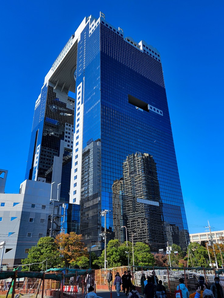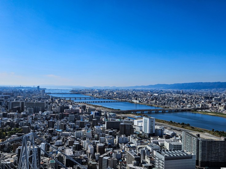 On Sunday morning we check out of our hotel and set out to see more of Osaka. Most places don’t open until 10 or 11 am so after breakfast we meander around Umeda for a while. Eventually we head over to the Umeda Sky Building, a distinctive building consisting of two 40 story towers connected by an observatory at the top. We are surprised to find the plaza at the base of the USB filled with something approximating a German Christmas market, complete with a huge artificial Christmas tree and booths serving mulled wine. In the US people are sort of compelled to wait until after Thanksgiving for such displays, but the lack of Thanksgiving in Japan makes for no barrier to seasonal creep. Not that Christmas is a Japanese tradition anyway, but in Japan shopping is always in season. If you’ve got ¥2000 to spare and don’t mind waiting in line for 15-20 minutes, the floating garden atop the Umeda Sky Building does offer expansive views of the city in all directions. The urban landscape fills all the space from the mountains where we hiked yesterday to the Seto Inland Sea.