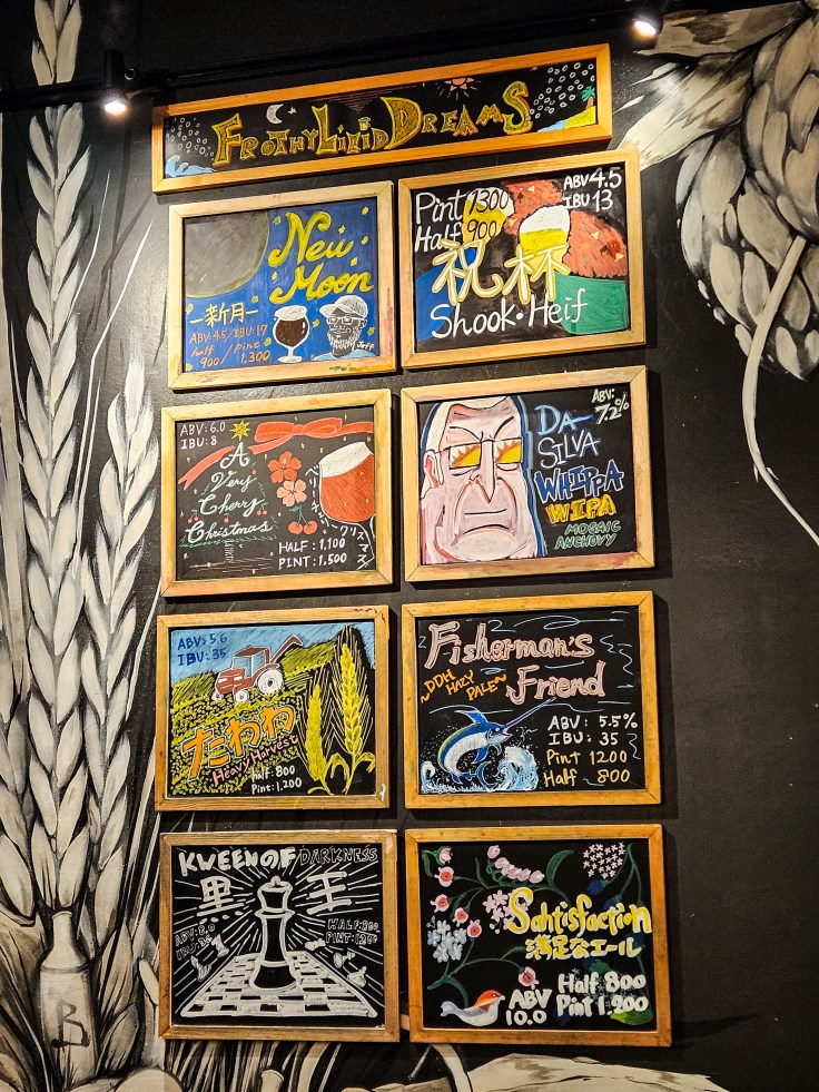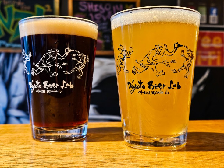 A lot of Japanese brewery taprooms go for a chic, clean, minimalist decor, but that’s not the case with Kyoto Beer Lab. The walls, bar, and small counter that runs around the outside of the cozy taproom are made from well worn wood. The 8-beer taplist is advertised on a hand drawn chalkboard with playful sketches accompanying each beer. Both times I visited there was a beer being served on cask, the only cask ale I encountered in Kyoto. There is a small patio with outdoor seating that looks out onto the relatively quiet backstreet with a canal running down the middle. Technically it’s the Takase River, but to my eye it looks more like a canal. The atmosphere here is convivial, not too different from a British pub. On both of my visits the clientele were a mix of Japanese and foreigners.