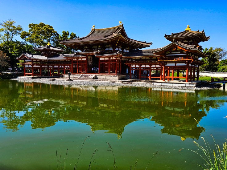 If you have the time and inclination for a day of visiting temples and shrines, I recommend you continue south on the JR Nara line. The next stop is right in front of the Fushimi Inari Taisha Shrine. This unique shrine features thousands upon thousands of vermillion torii gates tracing various paths up the mountain side. It is quite possibly Kyoto’s most popular shrine, in part because there is no admission fee and the complex is open 24 hours a day. If you get off at Rokujizo you can take the bus to Daigo-ji Temple. Another sprawling temple complex which features an exquisite garden commissioned by Hideyoshi Toyotomi (who unified Japan in the late 16th century) specifically for staging tea ceremonies while viewing the spring cherry blossoms. The pagoda at Daigo-ji was built in 951 and is the oldest surviving wooden structure in Kyoto. The small Bentendo Shrine is set at the base of a hill in front of a reflecting pond. It’s sufficiently picturesque that a photo of it graces the cover of my Japan travel book. Near the Bentendo shrine there is a traditional restaurant that serves a yuba (the skin taken off hot soy milk) and a tasty bowl of udon noodles. Further south in Uji, the green tea capital of Japan, is the impressive and distinctive Byodo-in Temple that appears on back of every 10 Yen coin.